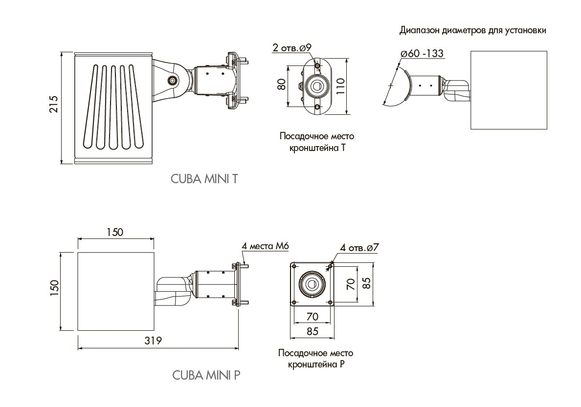 P — кронштейн для установки на плоскую поверхность