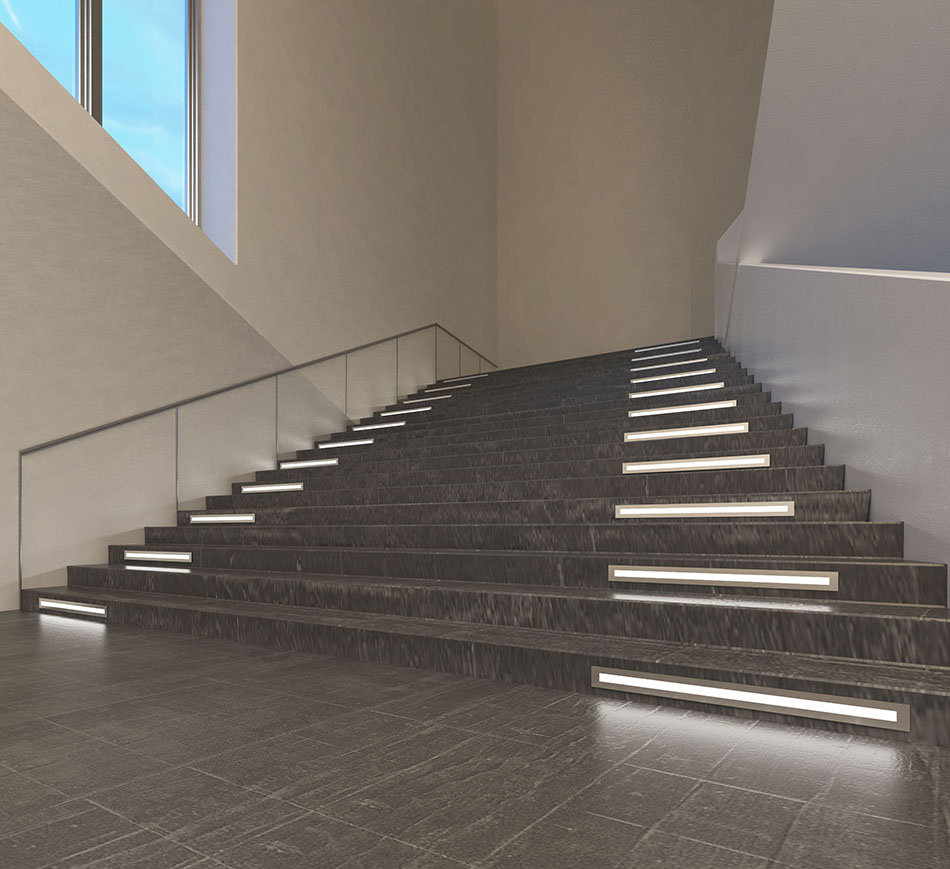 Светильники могут быть установлены в стены, ступени и другие вертикальные поверхности.